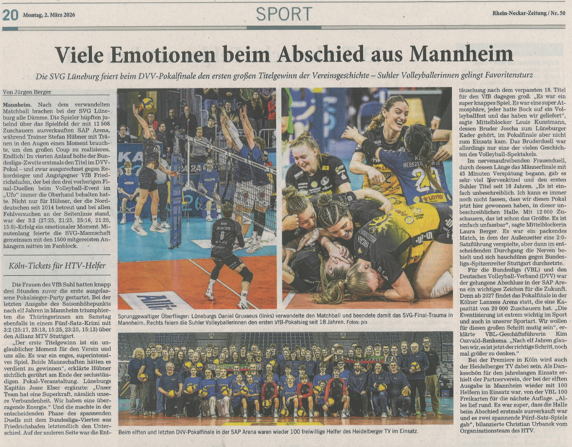 Bei der Abteilungsversammlung am 9.4.25 kandidierte unsere langjährige Abteilungsleiterin Martina Einsele (siehe auch den RNZ-Bericht unten) nicht mehr für diese Aufgabe. Der Abschied wurde entsprechend gewürdigt und wir bedanken uns bei Martina für ihre aufopferungsvolle Arbeit für die Volleyballabteilung des HTV. Als Nachfolger wurde Willi Wolfahrth gewählt, wir wünschen Willi viel Spass und Erfolg !!